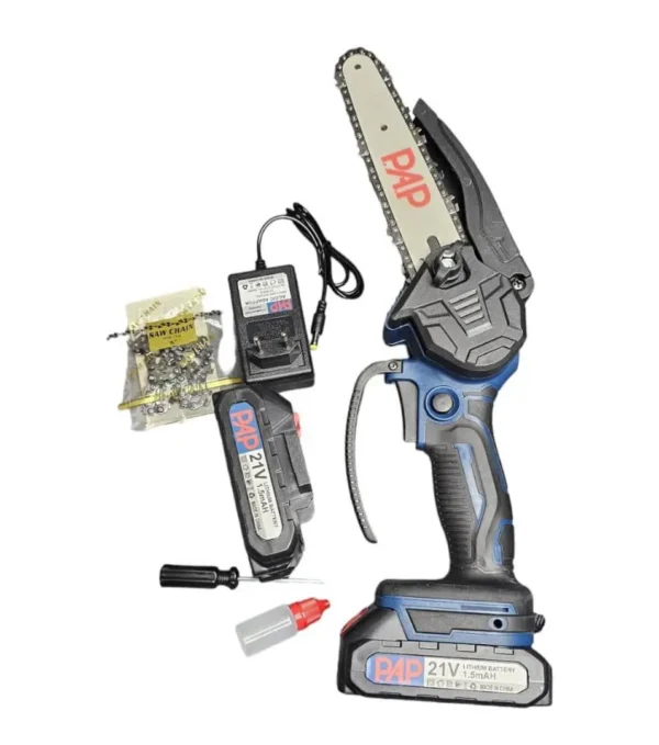 اره زنجیری شارژی PAP 21 ولت دو باتری لیتیومی 1.5 میلی آمپر ساعت طول تیغه 6 اینچ ( 160 میلی متر ) سرعت چرخش زنجیر 10 متر بر ثانیه مجهز به شاسی ایمنی در کنار کلید مجهز به گارد زنجیر و گارد دستگیره قابلیت تعویض زنجیر ( همراه با یک عدد زنجیر یدکی ) همراه با کیف حمل پلاستیکی و شارژر دارای یکسال گارانتی شرکت