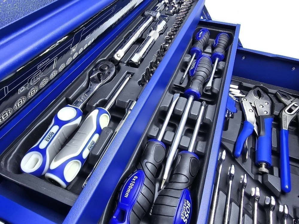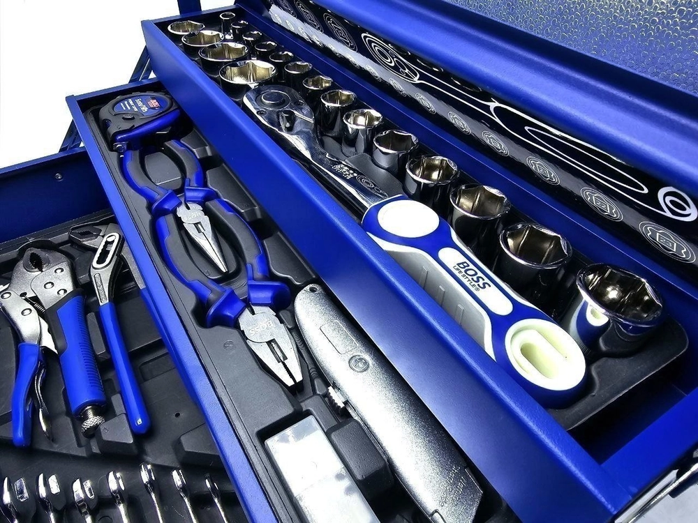 مجموعه جعبه بکس و ابزار ۸۵ عددی صنعتی باس (BOSS) | ست کامل ابزار حرفهای مناسب کار سنگین